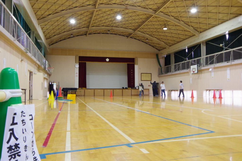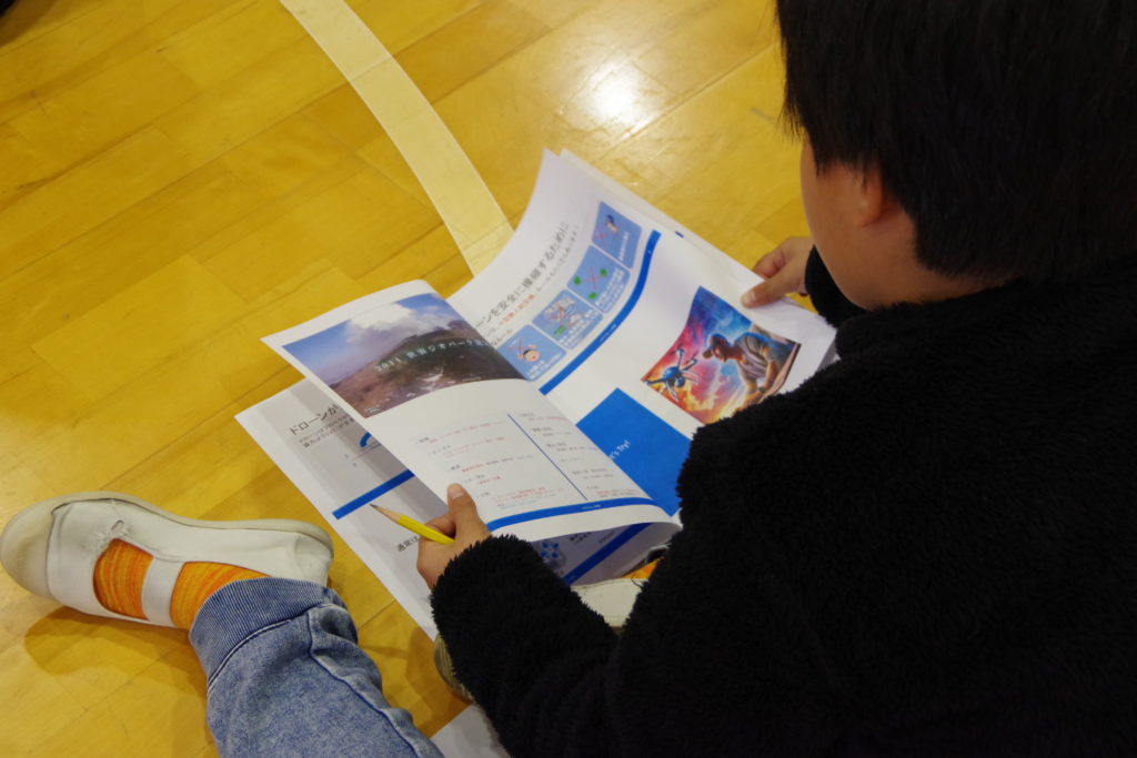 授業が始まると、小学生のみなさんはドローンを前に興味津々。学生たちが説明をしながら慎重に準備を進め、いよいよドローンがふわりと空へ上がると、「本当に飛んだ!」「すごい!」「かっこいい!」と体育館いっぱいに歓声が広がりました。キラキラした目でドローンを見つめる姿に、学生たちも思わず笑顔に。