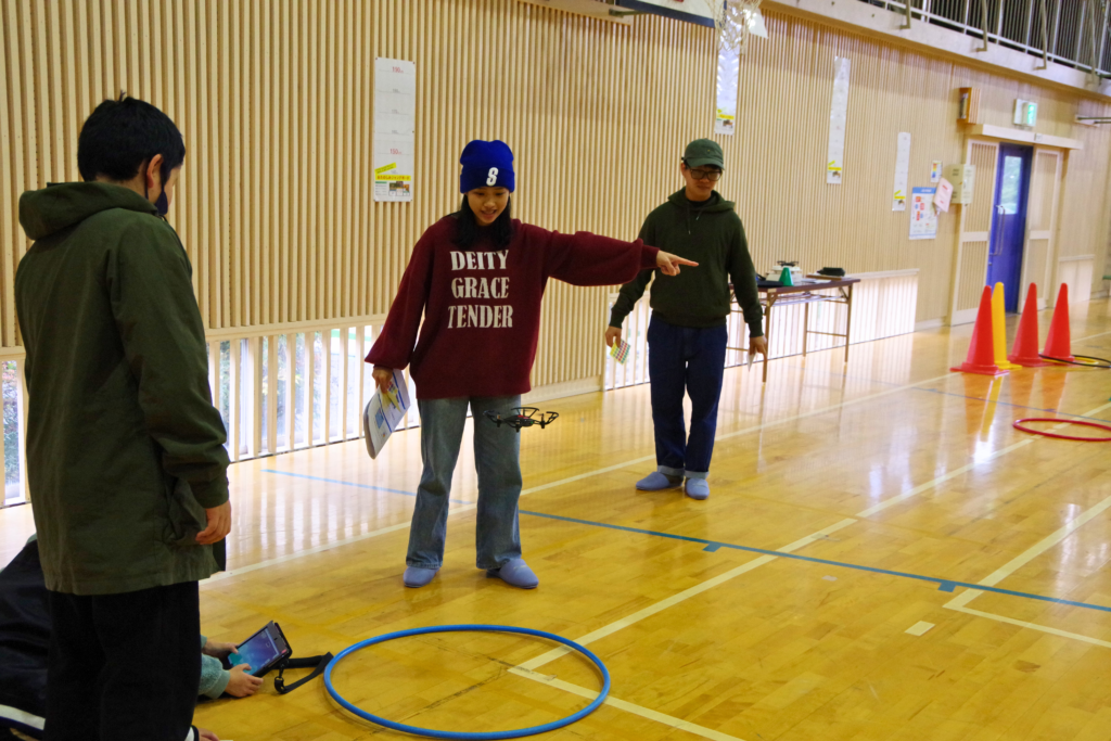 今回、学生たちが授業の教材として選んだのはドローン。「動くものを通じて、プログラミングのワクワクを実感してほしい」という思いから、ドローンの仕組みや安全な飛ばし方の説明、そして飛行コースの準備まで、すべて学生たち自身が担当しました。