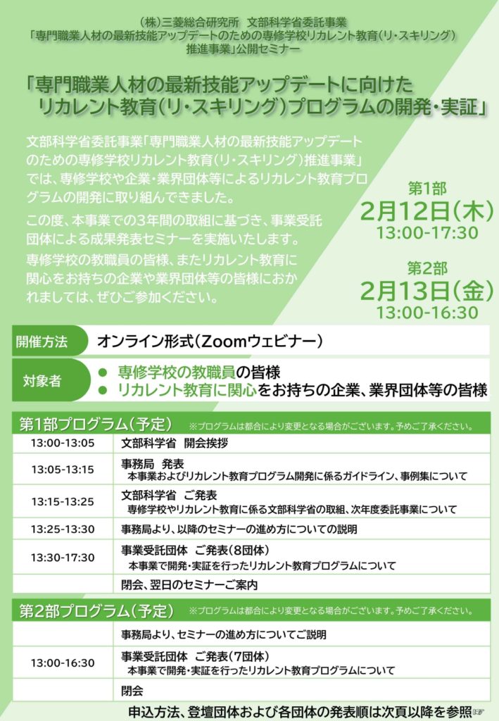 本セミナーでは、専修学校や企業、業界団体が取り組んできたリカレント教育の事例や、プログラム開発の成果が共有される予定です。