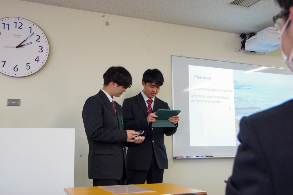 紹介されたのは、ガイドブックの定番にとどまらない“推し”の数々。天草の絶景スポットや、見た目が愛らしい「たぬきケーキ」など、高校生ならではの感性で選ばれたお気に入りが、スライドとともに英語で丁寧に語られました。