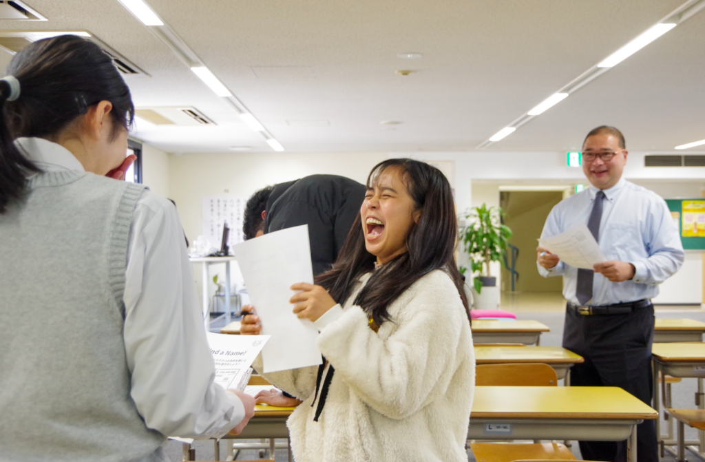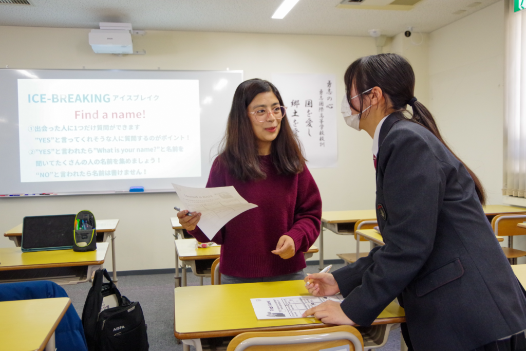 交流会の始まりは、互いに少し緊張した様子もうかがえました。ところが、英語で質問を投げ合うアイスブレイクのゲームが始まると、教室の空気がやわらぎます。