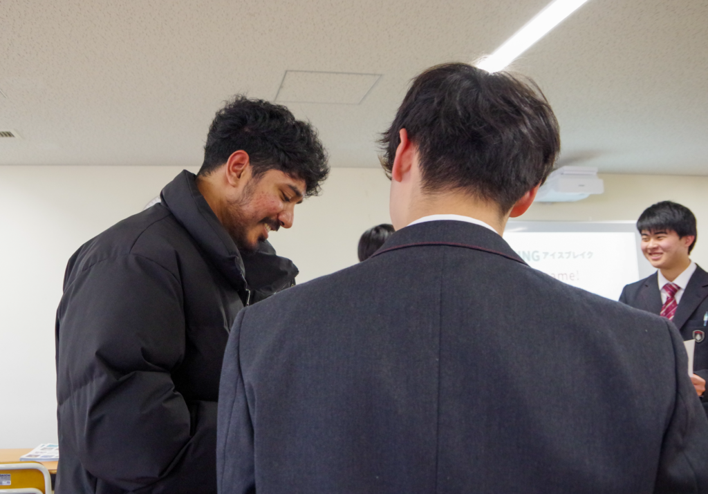 「日本のアニメは好きですか?」「ネパールに行ったことはありますか?」といったやり取りをきっかけに、あちこちで笑い声が広がっていきました。共通言語の英語を通して会話が弾み、初対面の緊張が少しずつほどけていくのが伝わってきました。