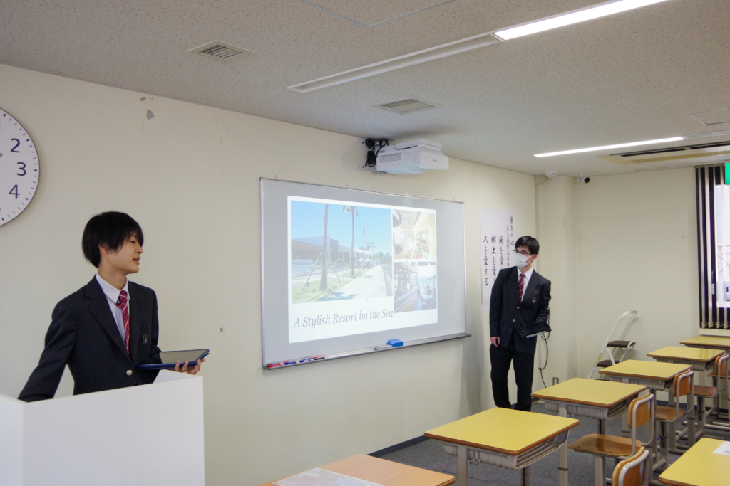 緊張がほぐれたところで、勇志国際高校の皆さんによる英語でのプレゼンテーションが始まります。テーマは「留学生に熊本の魅力を紹介しよう!」です。
